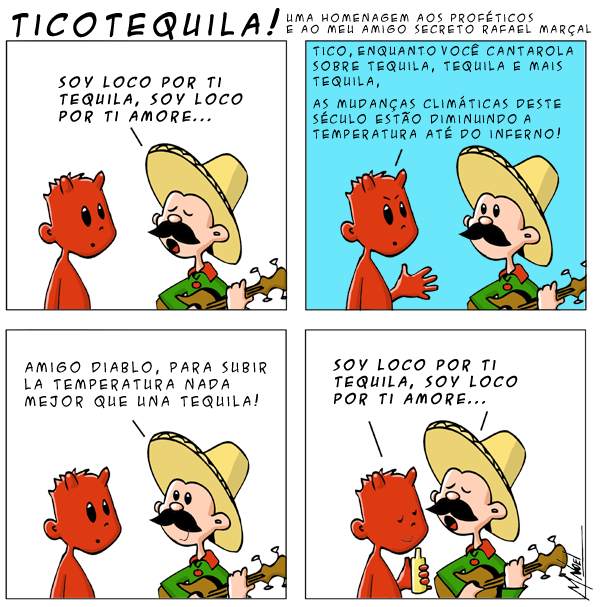 Neste final de ano os integrantes do grupo Webcomics Brasil do qual faço parte, resolveram fazer um Amigo Secreto. A idéia era fazer uma tirinha com os personagens do nosso amigo secreto. O meu homenageado é o Rafael Marçal dos Proféticos (http://profeticos.net) Resolvi então fazer uma tirinha com o Tico Tequila e o Diabo.